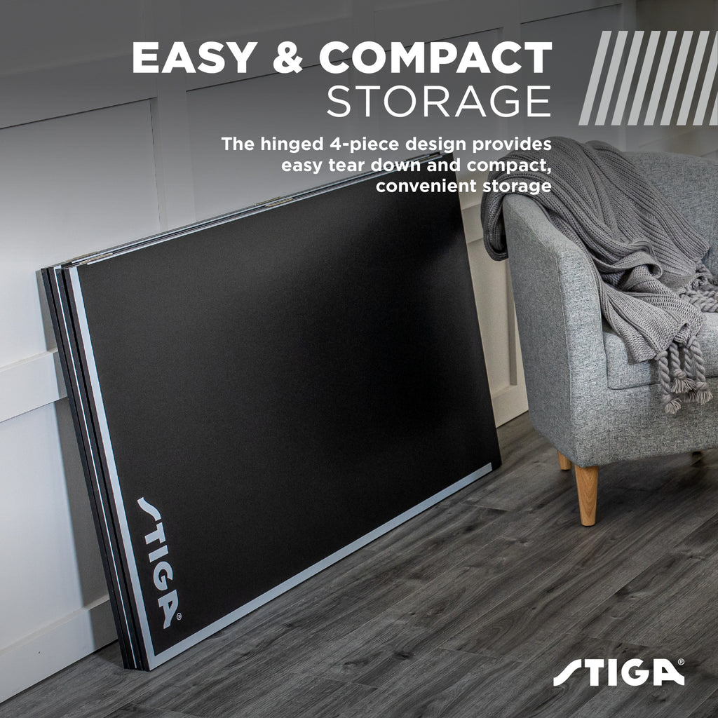 You don't need a game room. Simply turn any pool table into a table tennis table with the STIGA 4-Piece Table Tennis Conversion Top. This 9'x5' hinged 4-piece table top provides easy set up, tear down and storage. Simply slide under the bed or in the closet when you're done playing. The Conversion Top's repeat roller coat painted play surface with silk screen play field lines and 12mm top thickness provides improved playability and durability, while the adhesive EVA pads protect your existing table. This top comes ready to play with its included net and post set.