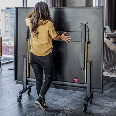Simply, fold the two independent table halves into their safety locks and effortlessly glide into the perfect space.