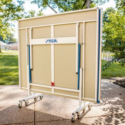 Skip the stress of rearranging furniture to fit a table tennis table inside your home and enjoy table tennis outdoors. The STIGA XTR Outdoor table is designed and manufactured with durable, all-weather materials such as aluminum, exterior grade powder coating, and galvanized steel for a table that is waterproof, and resistant to rust and sun damage, making it perfect for year-round outdoor storage in any climate. This table comes 95% preassembled with only one simple step to complete so you can begin playing in less than 10 minutes. The 6mm aluminum/composite top is supported by a stout 1.5" tubular steel apron to deliver lively and even bounce across the entire surface and resists warping under any condition. The table includes a 72" exterior grade net and post set with string tension adjustment for excellent playability. Below the table, sturdy 1.25" welded steel legs include a self-opening feature, so they automatically deploy when opening or folding the table halves for added convenience and safety. The legs also include adjustable height leg levelers to ensure your table has a solid, level playing surface on any terrain. For added flexibility and mobility, the table features 3" ball-bearing wheels that smoothly roll and lock into place for safety. This table includes playback mode for individual practice and each table half can be separated and used as a free-standing multi-purpose table for dining, playing cards, and more. After playing, conveniently fold each table half into the upright position, lock into place with the red safety latch, and roll to the desired location for convenient storage. The separate table halves of the XTR nest together for an ultra-compact folded profile so it can fit into any space.