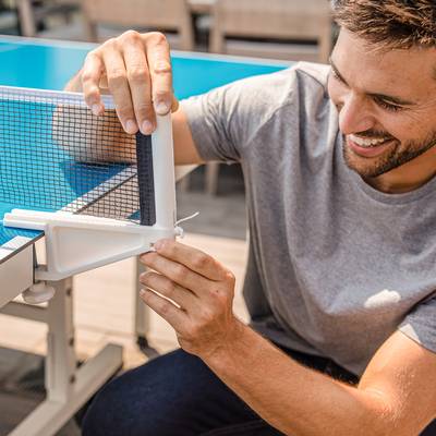 This weatherproof net and post set easily attaches to your table while offering tension adjustment for your exact specifications.